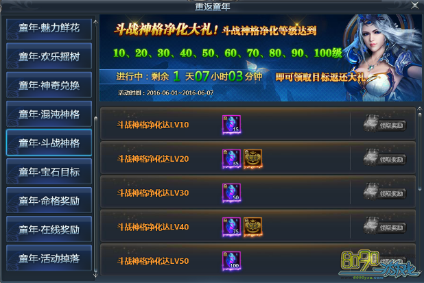 【活动内容】:神格净化更强大,每个神格都蕴含着神秘专属斗战,需要经过净化才能绽放!活动期间,斗战神格净化等级的数量达到指定目标,即可获取神格净化荣誉称号!