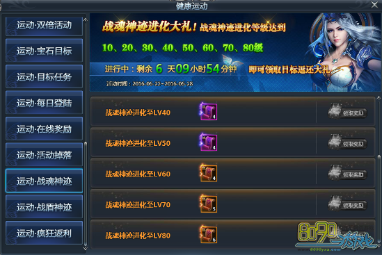 【活动内容】:战魂神迹进化大礼! 战魂神迹进化等级达到10、20、30、40、50、60、70、80级,即可领取目标返还大礼