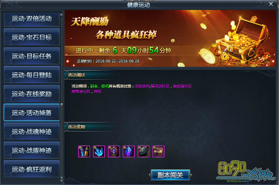 【活动内容】:活动期间,副本及挂机将有概率掉落:运动饮料,精灵进阶石,神印提升石,