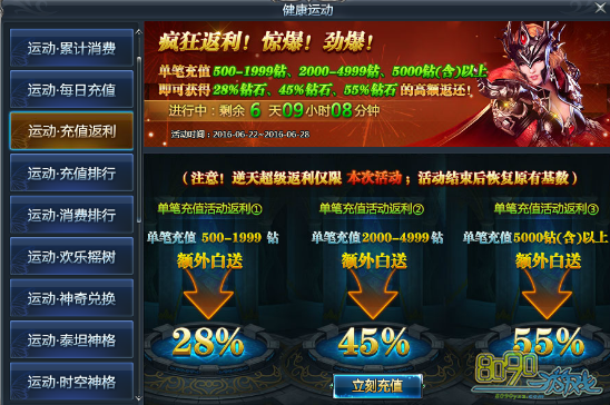 2.单笔充值2000~4999钻即可获赠45%钻石高额返利!