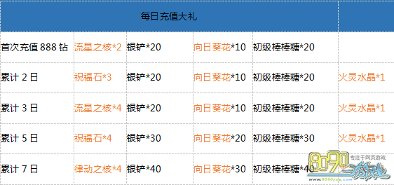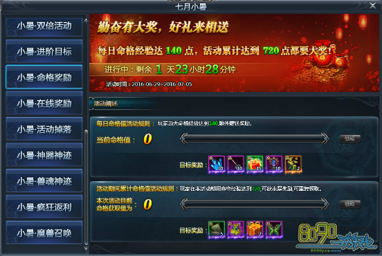 玩家当天命格经验达到140,额外赠送奖励:精灵进阶石*10,银铲 *10,绑定初级宝石随机礼包*15,神印提升石*10,油菜花香*2
