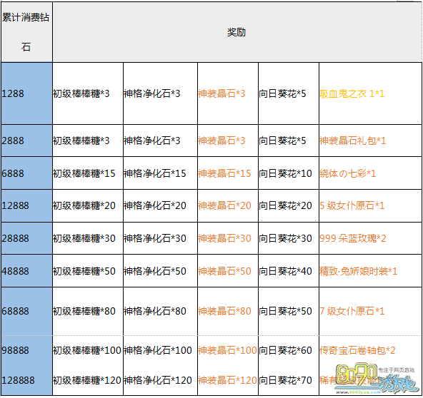 【活动内容】:活动期间累计消费达到一定额度即可全面返还豪礼!大量初级棒棒糖、神格净化石、吸血鬼之衣1、向日葵花、稀有超级技能包,极品道具不可错过!