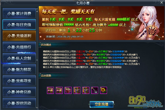 【活动内容】:活动期间,小充一把玩玩,奖励大把爽爆!累计1天、2天、3天、5天,7天,每天仅需充值888钻石以上,即可领取价值28888钻石大礼包!战力飙升6500+!