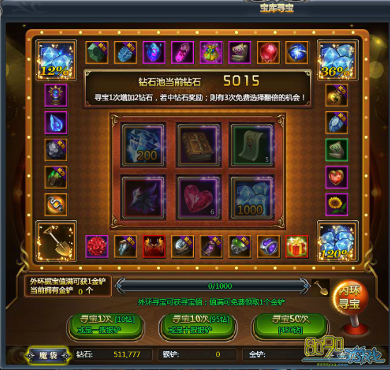 【活动内容】:活动期间,可使用银铲或10钻石进行寻宝,宝库内藏着包括“向日葵花”、“贵重道具”、“各种宝石”,“非绑钻石”等,更有机会获得“金铲”,金铲可用来砸高级的内环宝藏,内环宝藏更是藏有大量珍稀的道具!