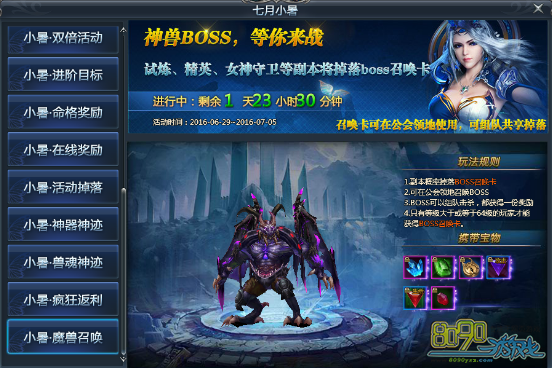 【活动内容】:活动期间,试炼、精英、女神守卫等副本有概率掉落BOSS召唤卡,等级≥64级的玩家有几率获得召唤卡,可在公会领地召唤BOSS,组队击杀可共享掉落;