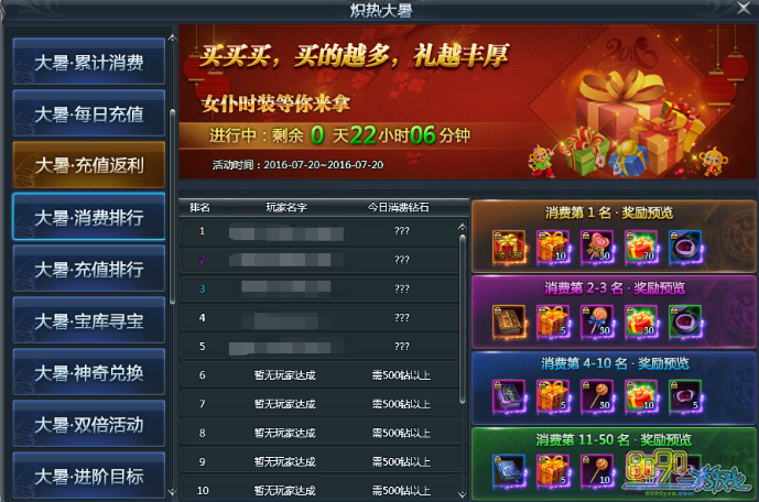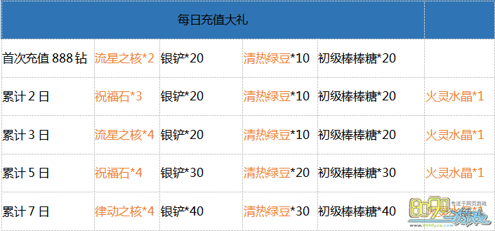 备注:1.单日充值达到888钻石以上即可累积1天,累积达到指引天数即可领取奖励