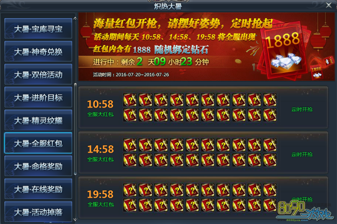 【活动内容】:活动期间每天10:58,14:58,19:58系统将定时发放全服红包,海量钻石红包开抢,请摆好姿势,定时抢起!