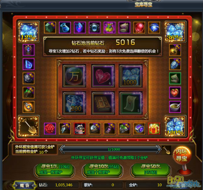 【活动内容】:活动期间,可使用银铲或10钻石进行寻宝,宝库内藏着包括“清热绿豆”、“贵重道具”、“各种宝石”,“非绑钻石”等,更有机会获得“金铲”,金铲可用来砸高级的内环宝藏,内环宝藏更是藏有大量珍稀的道具!