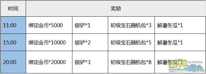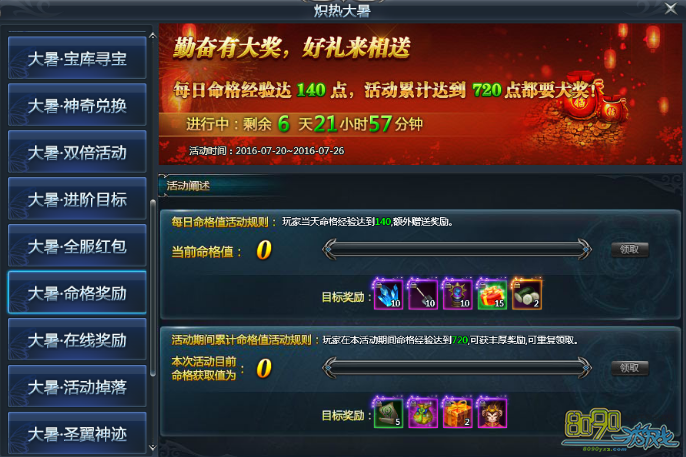玩家当天命格经验达到140,额外赠送奖励:精灵进阶石*10,银铲 *10,绑定初级宝石随机礼包*15,神印提升石*10,解暑冬瓜*2