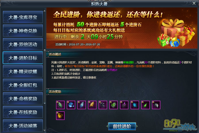 【活动内容】:风暴大陆进阶大狂欢,活动期间,坐骑、宠物、圣翼、神装等所有进阶,凡消耗50个进阶材料,系统自动返还5个进阶材料;同时,若当日"每日目标"所对应的系统进阶成功,还将获得额外的一份丰厚的奖励!
