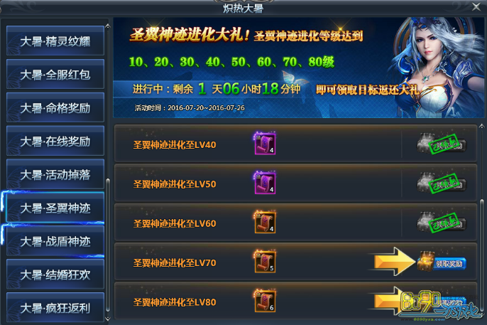 圣翼神迹进化至LV70,即可获得顶级神迹保护符*5