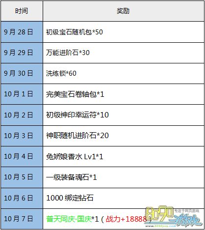 钻石祝福大型金币袋*5,初级宝石随机包*10,大型灵气瓶*2,重阳蒸糕*5,50绑钻卡*1