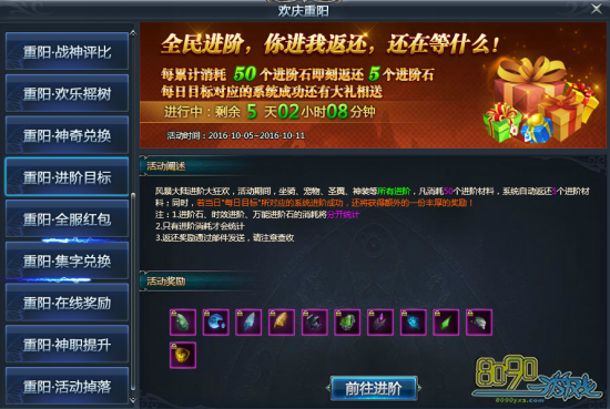 【活动内容】:风暴大陆进阶大狂欢,活动期间,坐骑、宠物、圣翼、神装等所有进阶,凡消耗50个进阶材料,系统自动返还5个进阶材料;同时,若当日"每日目标"所对应的系统进阶成功,还将获得额外的一份丰厚的奖励!