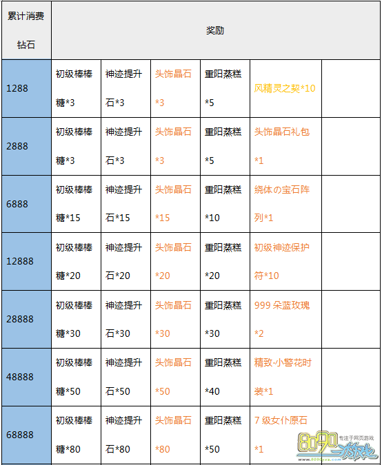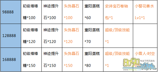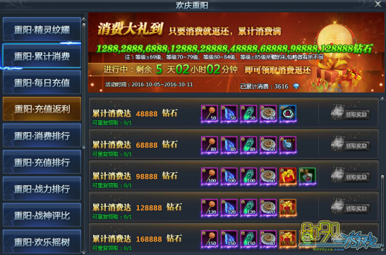【活动内容】:活动期间累计消费达到一定额度即可全面返还豪礼!大量初级棒棒糖、神迹提升石、绕体の宝石阵列、重阳蒸糕、超级/顶级技能包,极品道具不可错过!