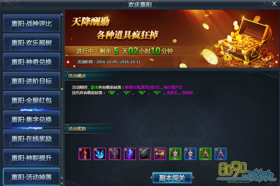 【活动内容】:活动期间,副本将有概率掉落:醇厚白酒,精灵进阶石,神印提升石
