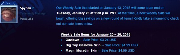 游戏官方会在1月20日下午2:30(太平洋标准时间)结束。同时,新一周的特惠将开始,新一批的商品将降价。也就是说今天下午2点半之后就不能买这周的皮肤了。