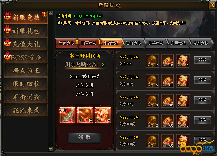 开服前三天,根据玩家的总战力进行排名,领取限定称号和红色装备。
