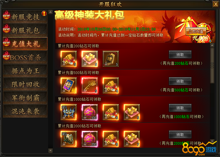 活动期间,充值元宝数量达到指定数额时,即可领取累充反馈奖励。