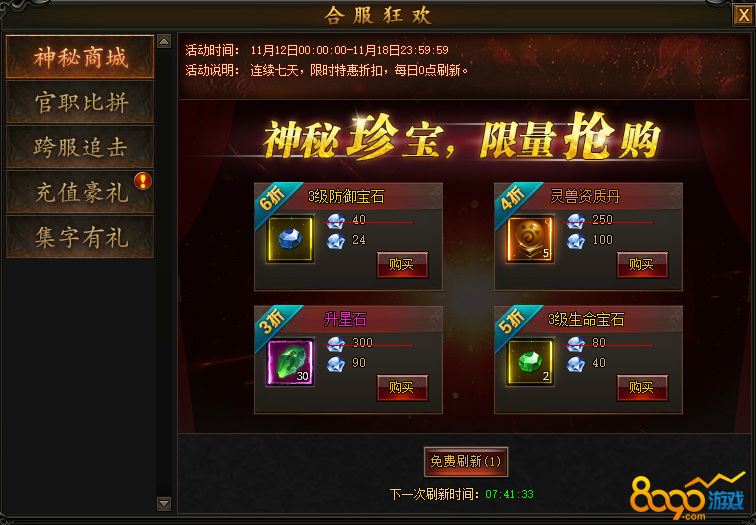 活动期间,神秘商城可刷出各种珍惜道具,超低折扣,限量抢购。