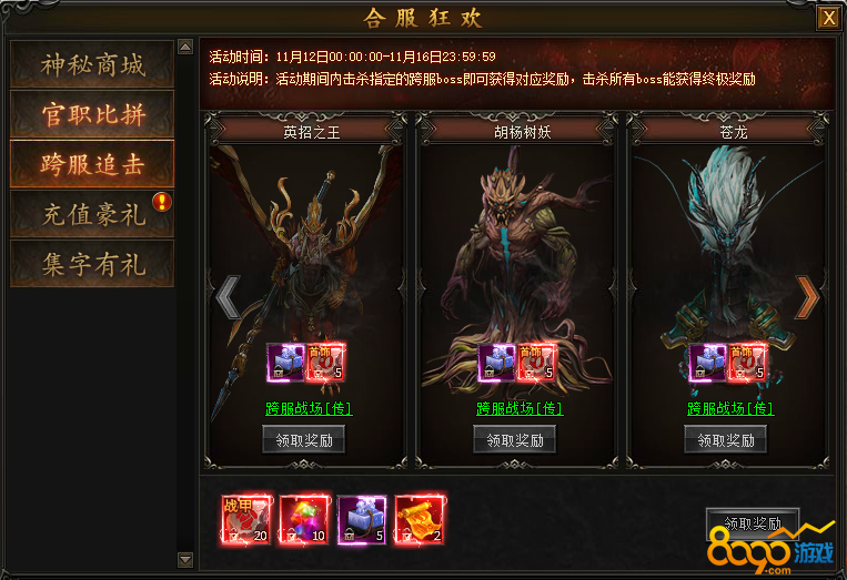 活动期间,击杀跨服对应的BOSS可获得额外奖励。