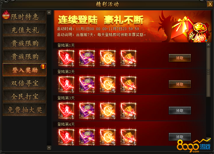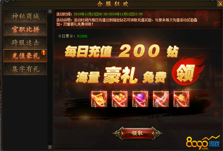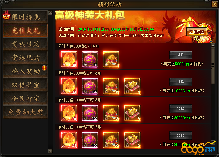 活动期间,充值元宝数量达到指定数额时,即可领取累充反馈奖励。