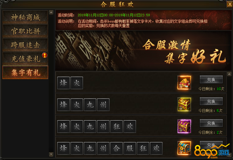 活动期间,击杀BOSS收集对应的文字可获得额外奖励。