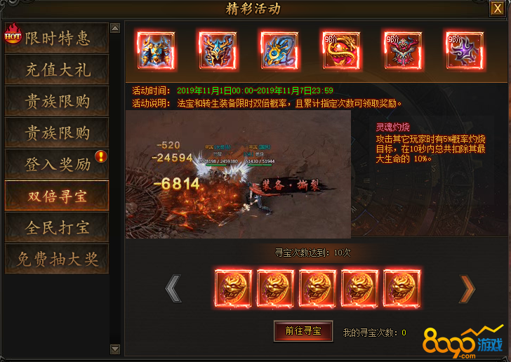 活动期间,宝物、法器、转生装备限时多倍几率。