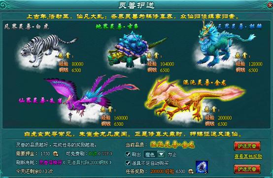 活动内容:在活动时间内刷新每天日常的循环任务和灵兽护送任务,即可得到最低为蓝色品质的任务,同时使用多次刷新的时候更能轻易刷出橙色和紫色的任务,完成的任务品质越高,获得的经验奖励越丰厚!