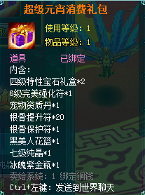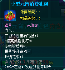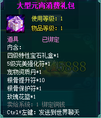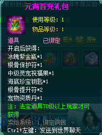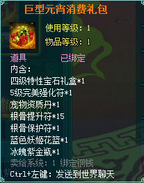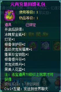 1,活动期间,玩家充值15元宝即可获得元宵充值大礼包,内含:冰魄紫金瓶*1、根骨保护符*1、中级灵宠祝福果*1、海底珍宝钥匙*1、根骨提升符*2、宠物资质丹*1。(注:法宝道具70级以上玩家才可获得)