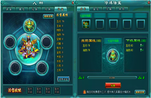 佩戴法宝的附加属性可通过成长修炼提升,每日免费提升3次,元宝提升10次。