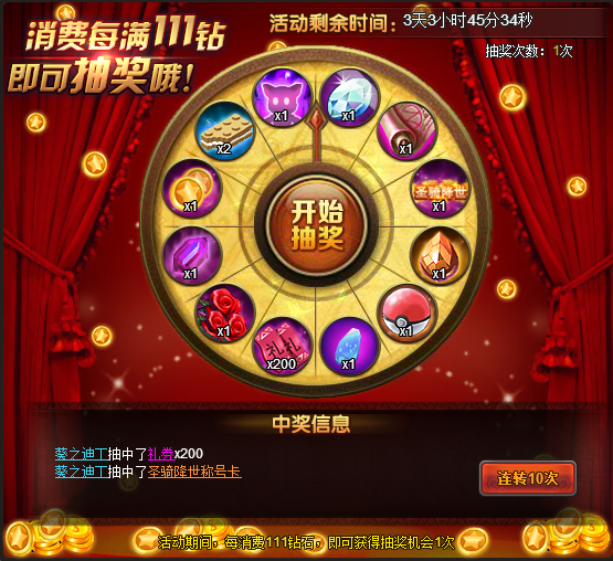 活动期间,每消费111钻石即可获得一次转盘机会,转动转盘有可能获得高属性称号哦!