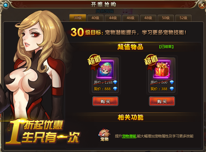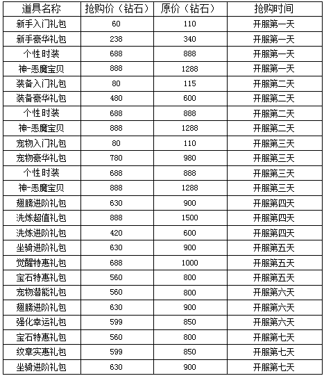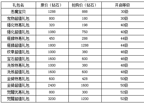 活动期间,玩家等级达到指定级数,即可享受低价购买对应的超值礼包,买到即赚到(每阶段抢购时间,为达到当前等级阶段之时起72小时内)。