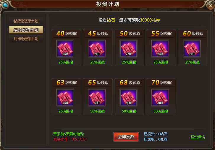 活动期间,所有玩家可进行投资,礼券投资计划:只需888钻石(连续10天可获得总价值1800钻石返利,其中含924钻石,672礼券264W金币);成长投资计划:只需1000钻石(可获3倍返利)