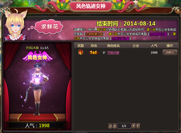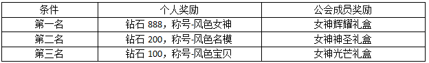 活动规则:活动期间,送花排行女神榜,前三名女神所在公会全体成员可获得奖励一份。
