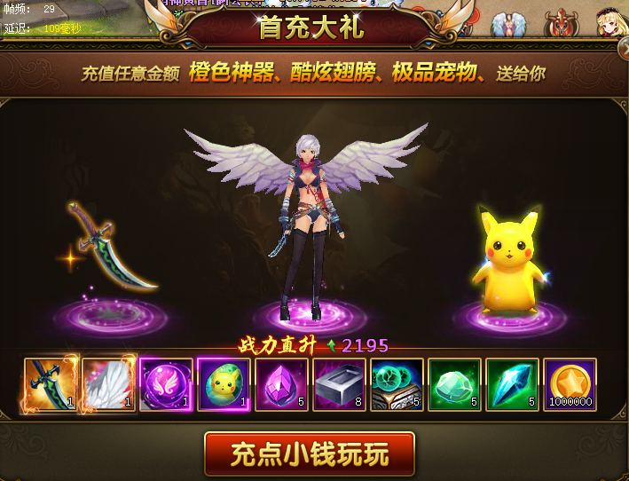 温馨提示:充值当天即可领取第一天奖励,橙色武器,精美翅膀、超猛宠物皮卡丘。第二天可领取强化冲榜福袋。