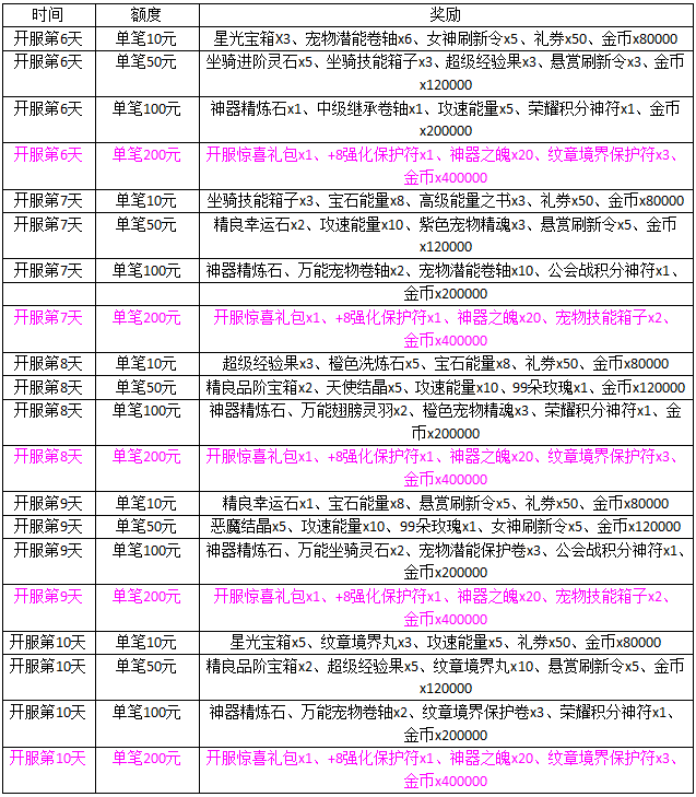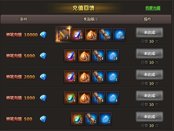 开服前五天,单笔充值达到一定额度可以获得对应奖励,每挡奖励最多可领10次。
