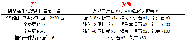 活动期间,装备强化总等级满足一定条件可获得对应奖励。