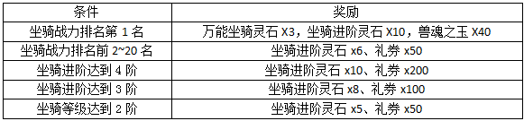 活动期间,坐骑战力满足一定条件可获得对应奖励。