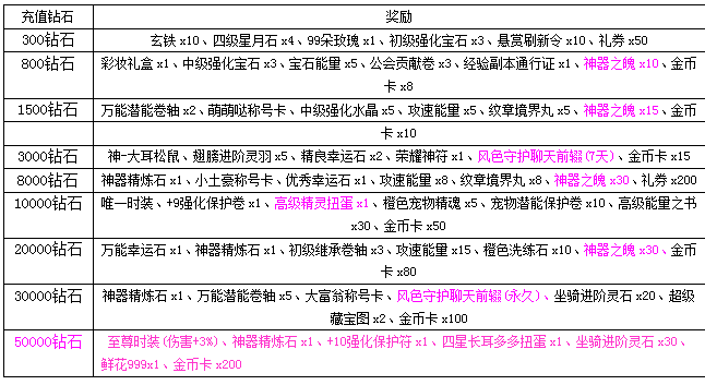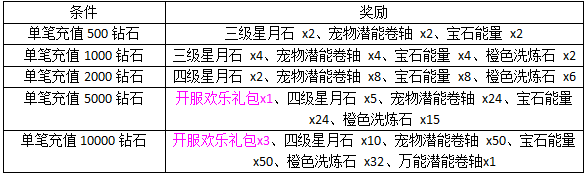 活动规则:活动期间,单笔充值满额,可领取对应奖励。单笔充值100钻石,500钻,1000钻,2000钻可获得对应奖励。
