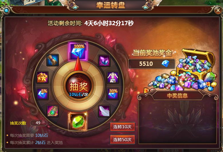 活动规则:活动期间,所有玩家有100次限时转盘的机会,100%中奖,所有奖励价值均大于10钻石。更有超级大奖100%奖池钻石!