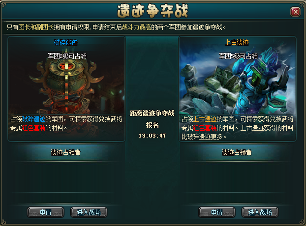 争夺遗迹有两种:上古遗迹和破碎遗迹。占领破碎遗迹的军团可探索获得兑换武将专属红色套装的材料。占领上古遗迹的军团,可探索获得兑换武将专属红色套装的材料,同时上古遗迹获得的材料比破碎遗迹更多。