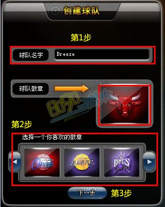 首先要填写球队名称。然后选择队徽和徽章。当家球星介绍。当前球队成员整理进攻/防守及工资、工资帽总和。如果不满当前球队任务和属性可以点“换一组”更换。最后选择你最喜欢的小秘书形象。