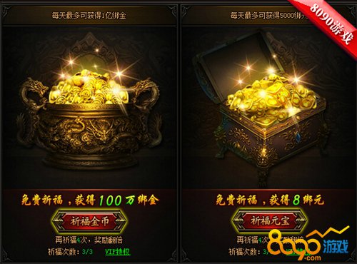 在8090新焚天之怒中可以获得金币的方法还是有很多的,其中最快速的就要属祈福了,在游戏中祈福分为祈福绑金以及祈福绑元顾名思义就是可以获得大量的绑定金币和绑定元宝。