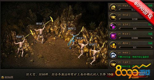 还有一个快速获得金币的方法就是黄金矿工了,在8090新焚天之怒中黄金矿工的玩法跟其他的玩法可一点都不一样哦,不仅仅可以获得大量的绑金和邦元还可以获得宝石碎片、转生修为、魂珠碎片、特戒碎片以及元宝哦。