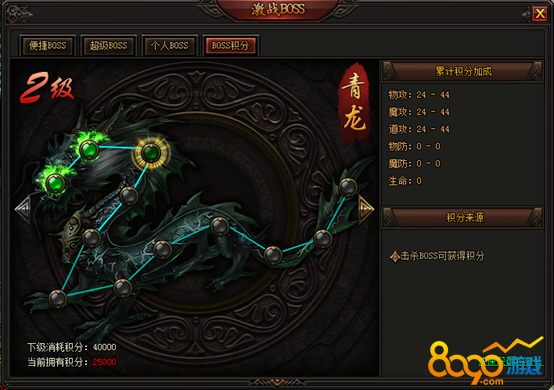 游戏中,玩家击杀BOSS可以获得对应的BOSS积分,使用BOSS积分可以激活激战BOSS的属性,增加攻击防御跟生命。打的BOSS越多,增加的积分越多,属性自然快速增长。