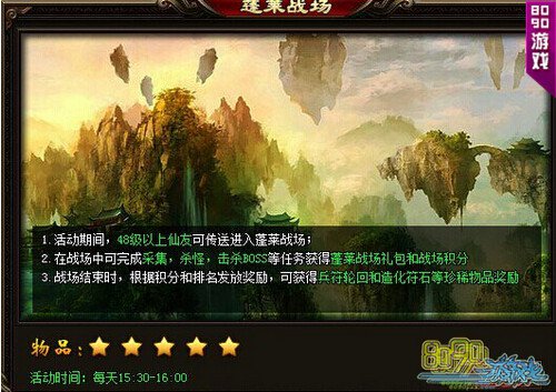 仙友需要在蓬莱战场中完成采集、杀怪等任务,任务完成可获得礼包或者积分。战场中击杀异盟的仙友可抢夺对方的积分,进入战场开始,每一分钟可增加5点战场积分。活动结束后,战场积分排名前20的仙友可获得排名奖励,活动结束后,积分25以上的仙友,可获得积分奖励,积分越多奖励越多哦!蓬莱战场副本还可掉落兵符轮回俯视、造化符石等。