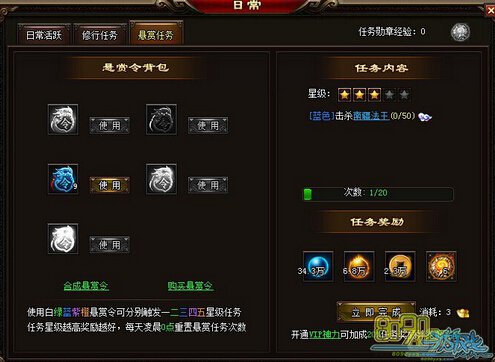 在8090封天战神中,玩家消耗不同品质的悬赏令,便可领取相应的悬赏任务。而悬赏令可通过商城购买、怪物掉落或是积分兑换获得。悬赏令的品质主要分为五种,品质从低到高分别是白、绿、蓝、紫、橙。品质越高,则任务的星级就越高,而完成任务后所获得的奖励也就越多。玩家使用这些悬赏令,就可获取相应的任务。