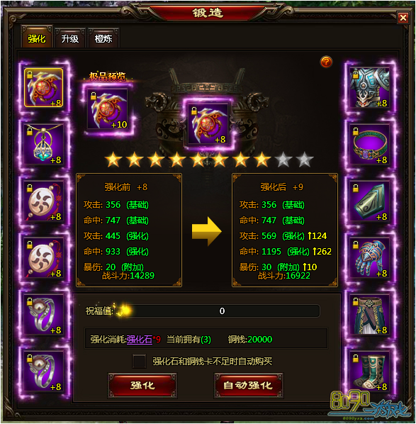 4. 每次强化失败装备不会掉级,同时获得一定数量的祝福值,祝福值越高,下次强化成功率越高。