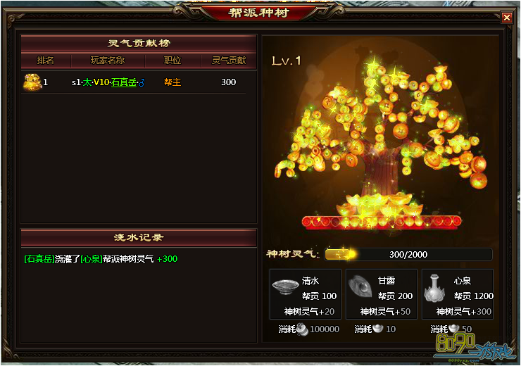 3)神树灵气可以使神树升级,神树升级时可获得海量的帮派财富,同时浇水的帮众可以获得帮贡和礼包。