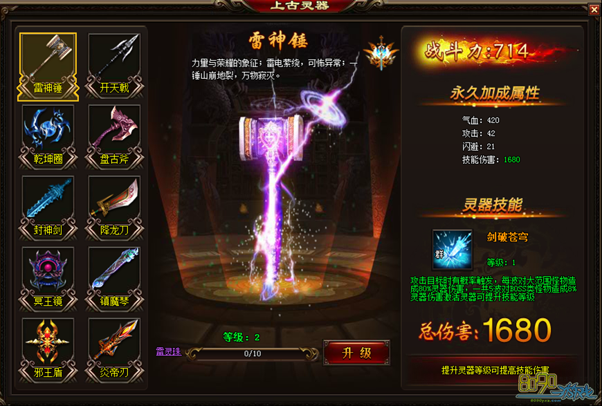 搜索"8090网页游戏"封天战神游戏中,角色等级升到35级时即可开启上古灵器系统,激活和升级灵器都可以增加大量的属性和战斗力,灵器被激活后,角色在攻击的过程中还有几率触发全屏大招,今天小编就为各位介绍一下。